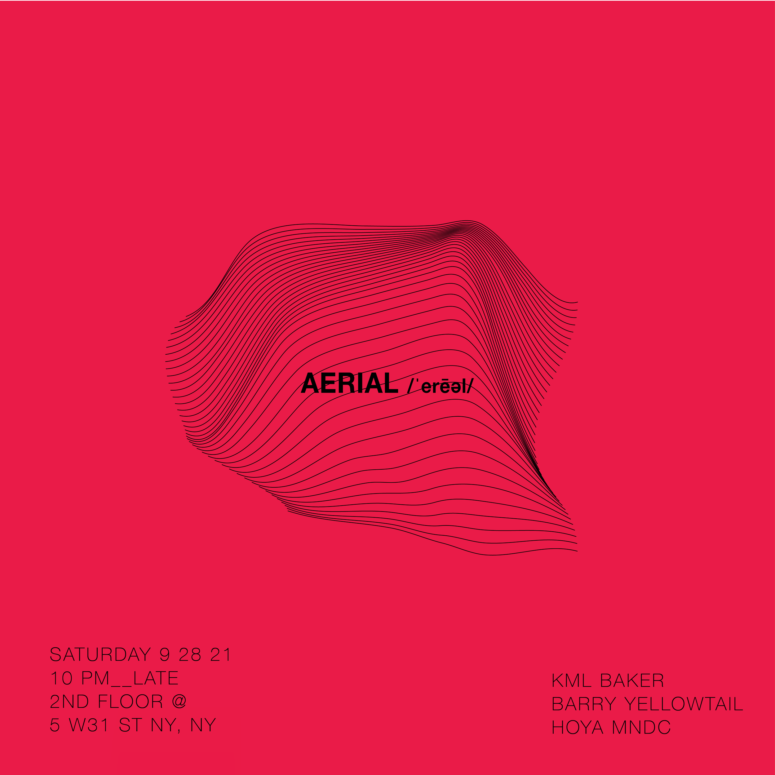 Aerial is a music-driven lifestyle events platform. Consisting of DJs and multidisciplinary creatives, Aerial focuses on producing intimate experiences throughout New York City, with the ultimate goal of nurturing a safe, healthy, and sustainable community of likeminded individuals.